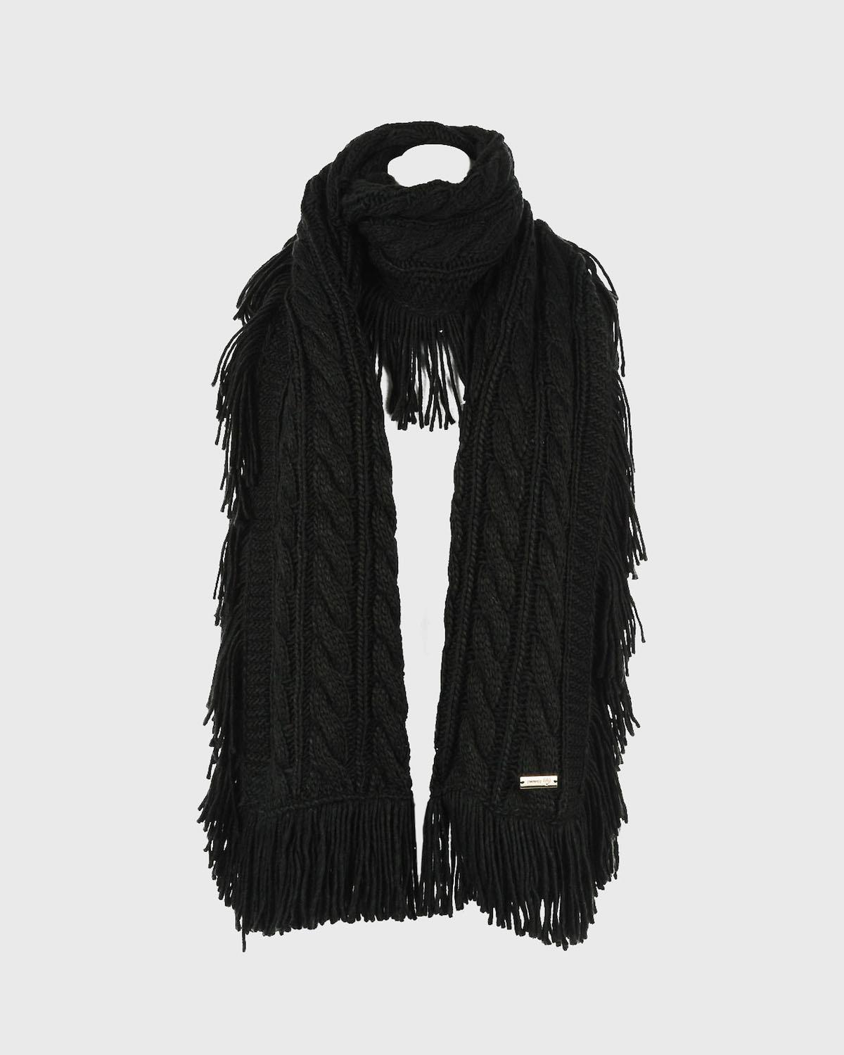 Non si può rinunciare a questo capo sul quale la maglia Tricot a trecce incontra lo charme delle frange in una sciarpa Twinset dalla bellezza senza tempo. Essenziale ma dal tocco ricercato è impreziosita dal logo in metallo. . Da abbinare alla cuffia coordinata per un look sofisticato nell'affrontare le rigide temperature invernali.